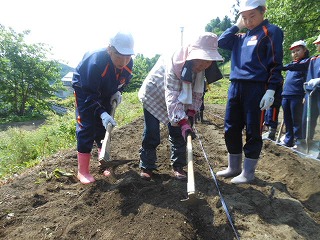 6年生が5年生に教えてあげたり、ボランティアのみなさんにコツを伝授していただいたりして、無事に立派な畑が完成しました!
