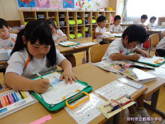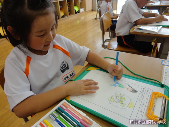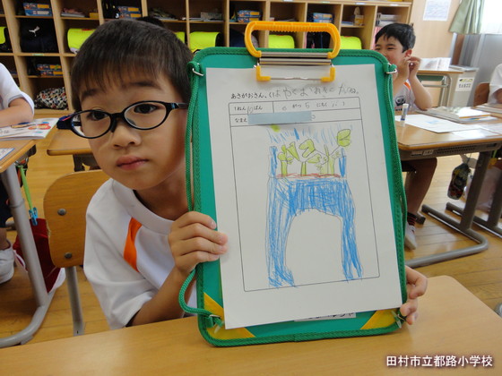 業間の後の3時間目は、生活科です。今日はアサガオの芽を生活科シートに描きました。みんな、よ~く見て描いていて、とても感心させられました。なかには、本葉の数を数えたり、葉っぱの手ざわりを確かめたりしながらスケッチする子もいました。外でのスケッチを終え、教室の中で生活科シートを仕上げました。