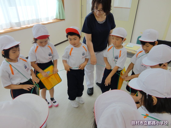 給食センターのお鍋の大きさと同じ大きさの輪にも入らせていただき、おうちのお鍋とは全然違うことを実感することができました。12人全員、輪っかに入ることができ、びっくり。