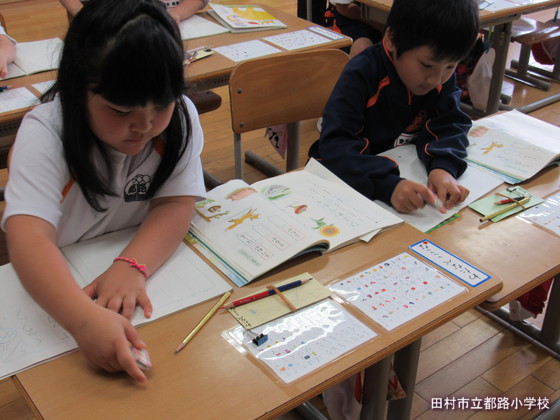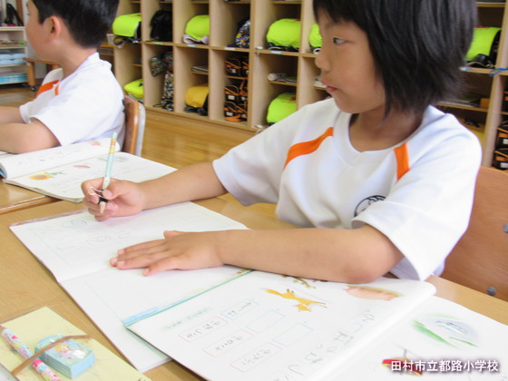 「いつ使うのかなあ~。」と思っていたノートを使い始め、みんな、はりきって文を書いていました。少しずつできることが増え、たのもしくなってきている1年生です。