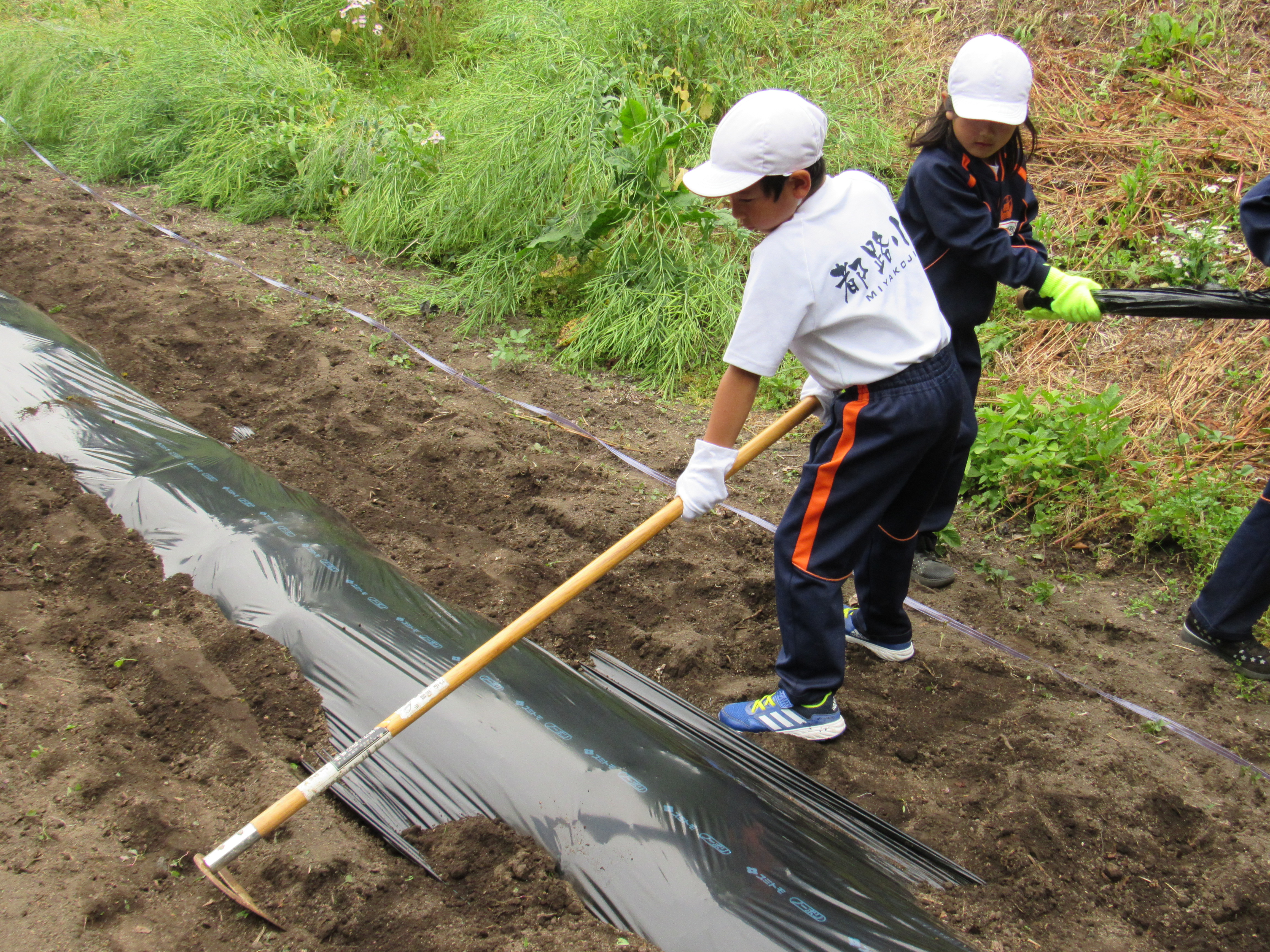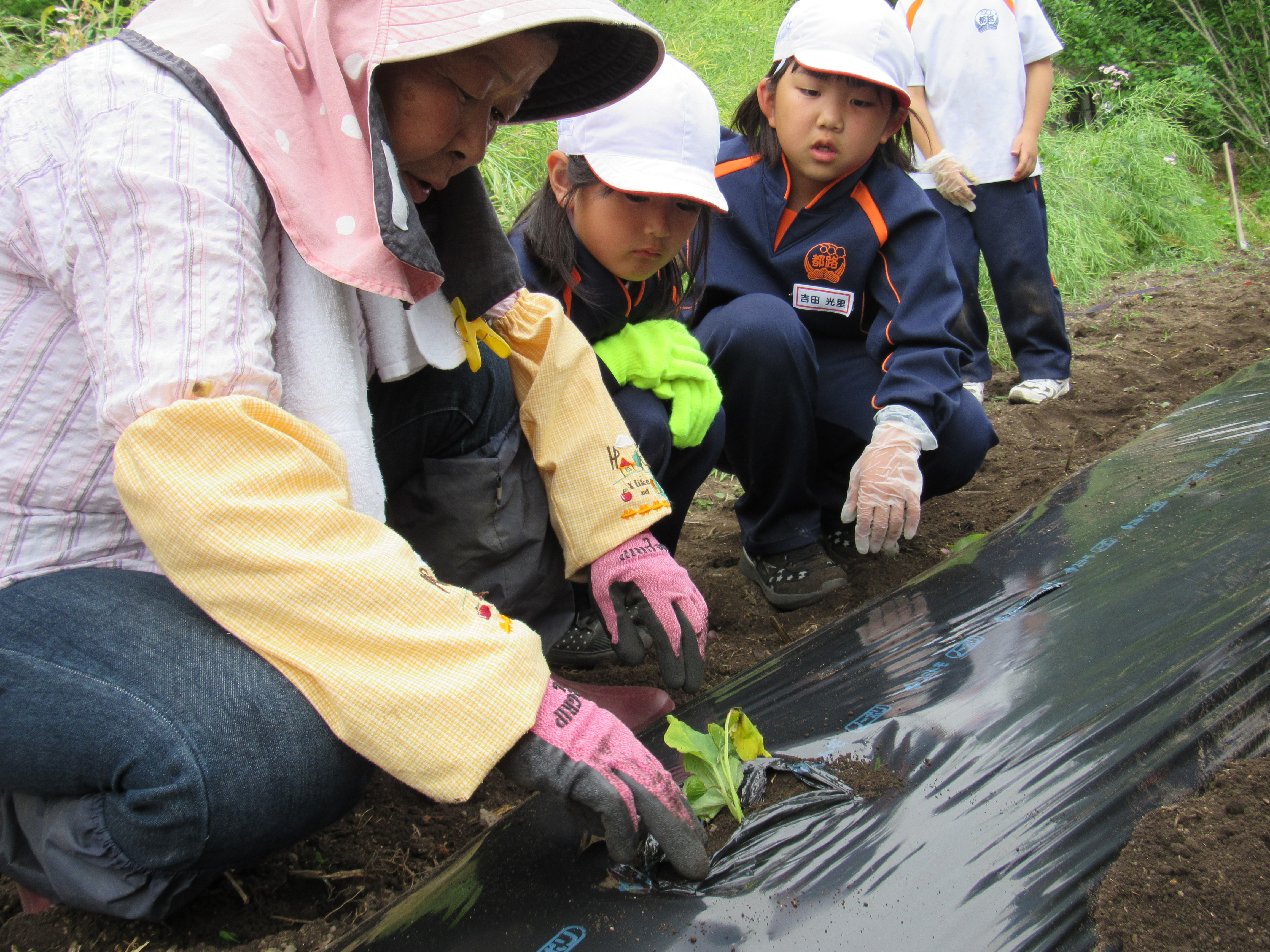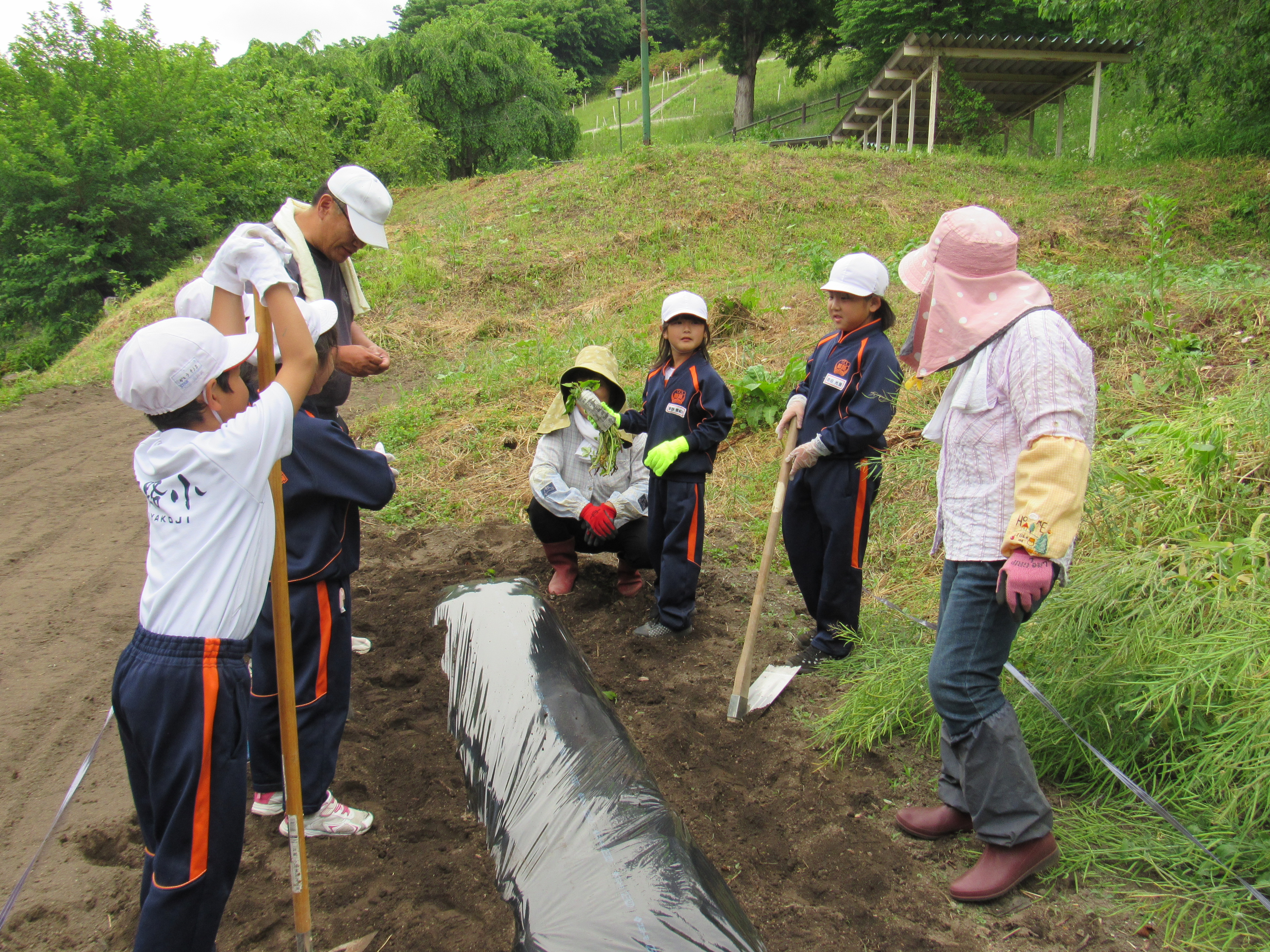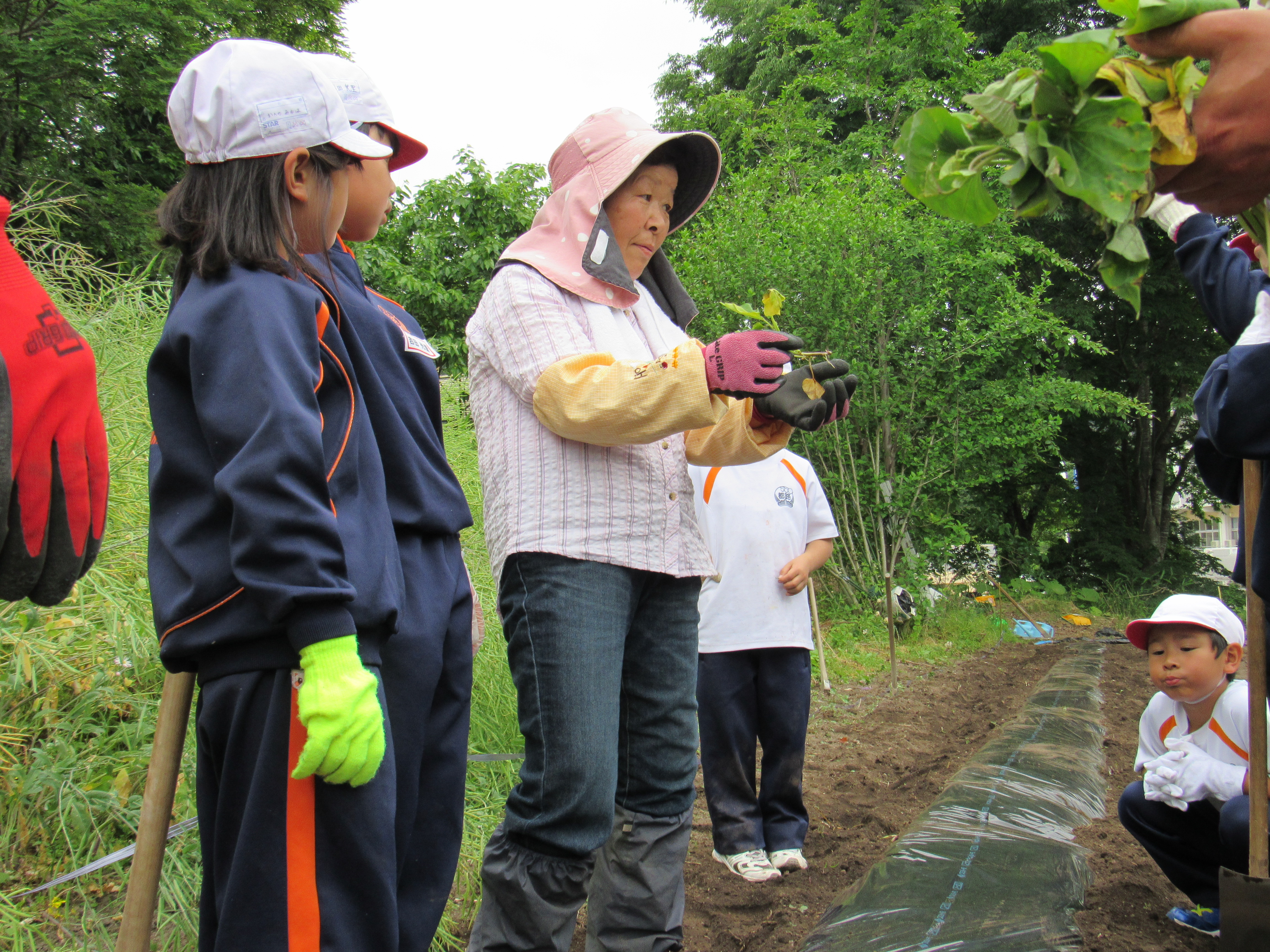 今日は、学校支援ボランティアの吉田さんと加藤さんにご協力いただき、2年生が野菜の苗や種を植えました。