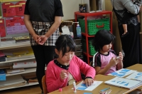 5時間目は生活科です。今日は、4階の理科室と図工室を探検しました。子ども達は、理科室が気に入ったようです。理科室で発見したペットボトルロケットや小さな骨の模型などを一生懸命に描き、校舎の地図に貼り付けていました。