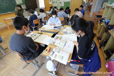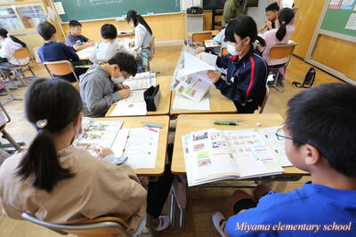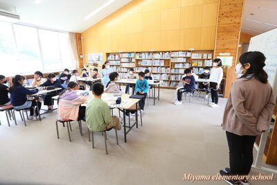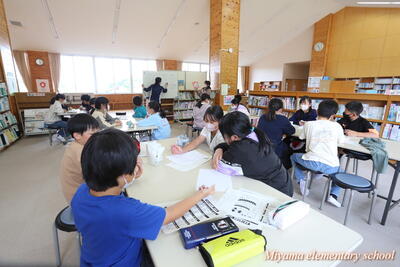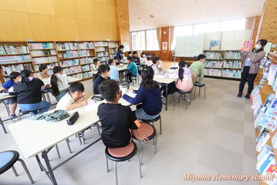 今日は5学年の授業の様子です。本校図書室にて、学校図書支援員の指導の基、本にあるラベルの秘密について学習しました。大まかな分類の説明後、先生から出題されたラベルの本を見つけ出しながら、図書室の秘密について理解を深める学習です。子どもたちは、グループの友達と話し合いながら、本を次々と見つけ出していきました。