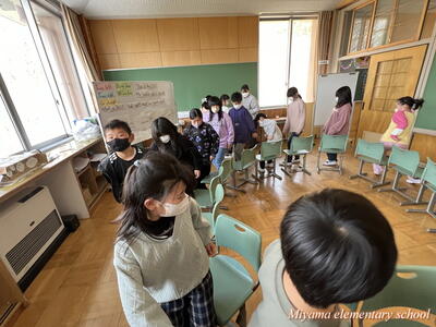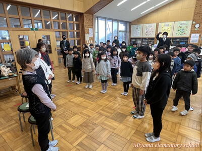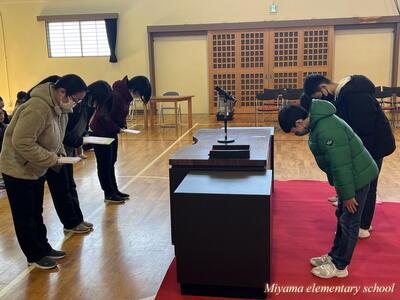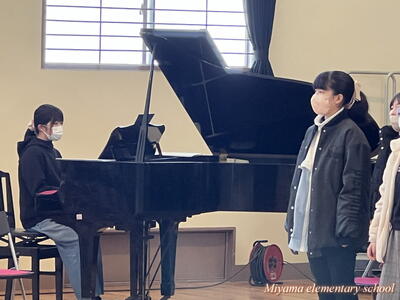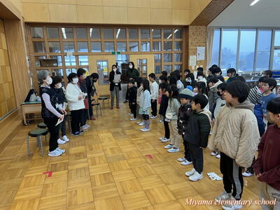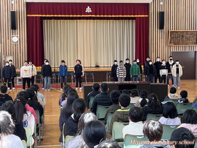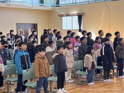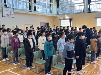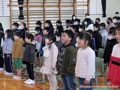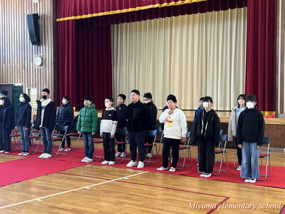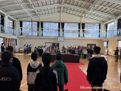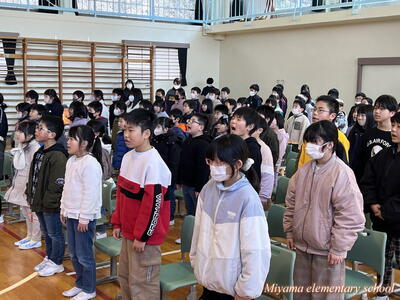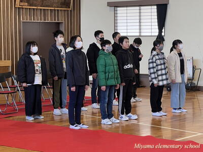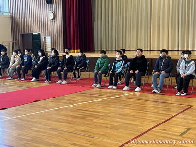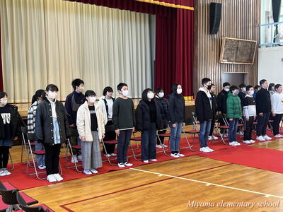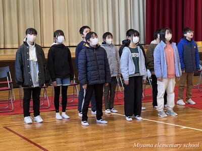 卒業式全体練習は2回目です。今日は、式の流れの確認、呼びかけ、式歌の練習をしました。呼びかけは、6年生のキリッとした立ち姿に在校生も刺激を受け、じっと6年生を見つめながら思いを言葉に乗せて精一杯声を出していました。式歌も、前回よりも声のボリュームがアップ。でもまだまだ声は出せそうです。美山小の歌声が、6年生と在校生で響き合うようにもう一歩頑張ります。