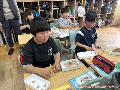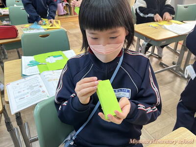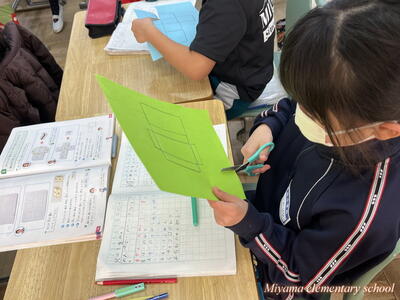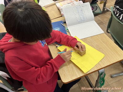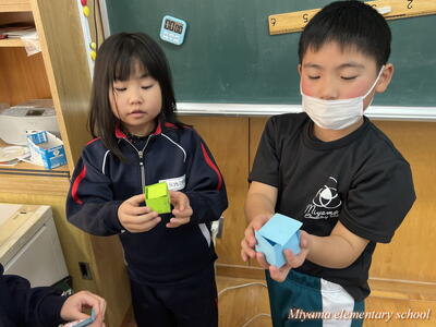 2年生は、算数科で箱の形を作る学習をしています。先週は、箱の面の部分を紙に写し取って、それを貼り合わせて箱をつくりました。面はつながっていると箱に作りやすいこと、同じ大きさの面は2つずつあることに気が付きました。