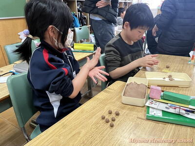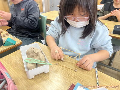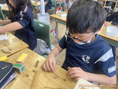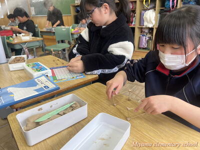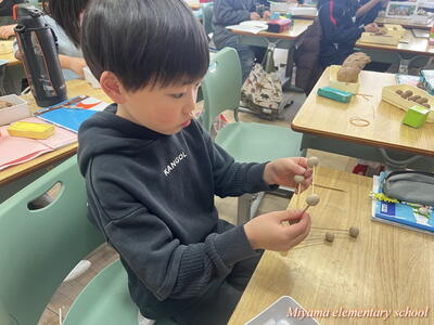 次に、粘土と竹ひごを使って箱の形を作りました。紙(面)ではないので、箱を頂点と辺でとらえる必要があり、難易度が上がります。粘土は何個あればいいのかな、同じ長さの竹ひごは何本必要かな、と考えながら作っていました。