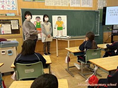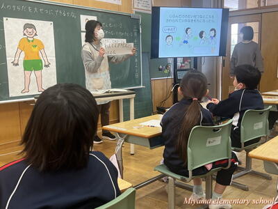1年生は、学級活動で自分の体を守ることついて学習しました。保健室の先生が、担任の先生と一緒に教えてくださいました。体は大切なところばかりですが、今日は特に、水着で隠れるところ「プライベートゾーン」についてです。水着で隠れるところは、自分から見せないこと、また見られたり触られたりしそうになったときは、はっきりと「イヤ」と言うことなどを学びました。「お風呂上がりにすっぽんぽんでいるのはやめよう」と話している子もいました。