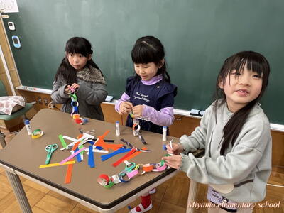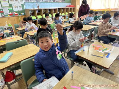 子どもたちが自主的に活動できる「いきいきタイム」は、今日が今年度の最後でした。それぞれの学年でラストの集会活動を楽しんでいました。1年生は明日のお楽しみ会に向けて係の子が中心となって飾りづくり。2年生は外で元気に鬼ごっこをして楽しみました。