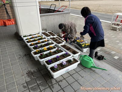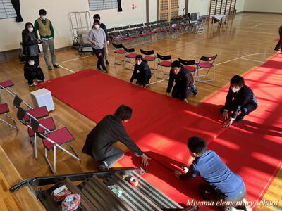 放課後は先生方で、式場の準備をしました。玄関を飾る花を事務の先生と用務員さんで植えてくださりました。体育館では絨毯などを丁寧に敷き直し、本番の形にしました。あと1週間で卒業式です。