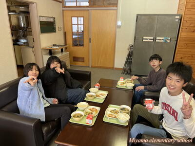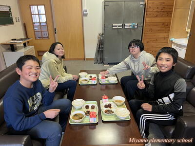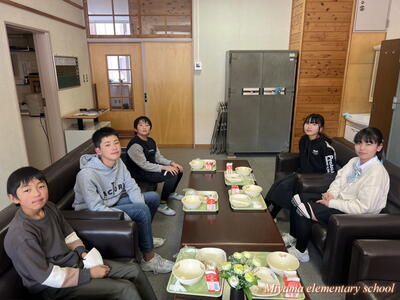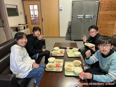 6年生は、卒業前の思い出に、数人ずつに分かれて校長室で給食を食べました。どうしても校長室のふかふかのソファーが気になるようで、ソファーに座って給食を食べてみたい、という要望があったようです。給食を食べながら、6年間の思い出や旧小学校でのびっくりするような出来事、中学校への期待など話をしました。話しているとあっという間に、時間が過ぎてしまいます。