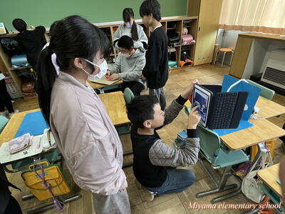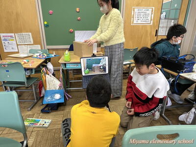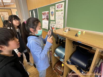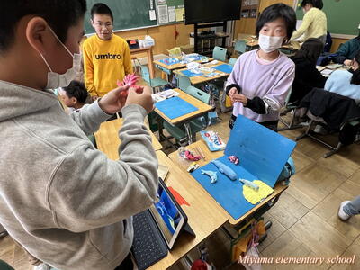 5年生が図工の時間に制作していたアニメーションは、キャラクターが完成し、背景等を加えて撮影を行いました。班ごとに決めたストーリーに沿って、キャラクターを動かしながらコマ撮りをして、最後に静止画をつなげてアニメーションの完成です。どんなストーリーのアニメーションができたのでしょうか? キャラクターがとてもかわいいので、見てみたいですね。