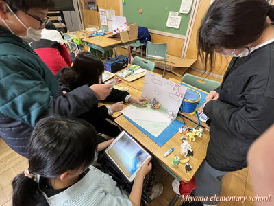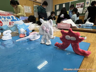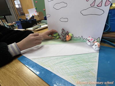 2024年3月15日 18時08分5年生が図工の時間に制作していたアニメーションは、キャラクターが完成し、背景等を加えて撮影を行いました。班ごとに決めたストーリーに沿って、キャラクターを動かしながらコマ撮りをして、最後に静止画をつなげてアニメーションの完成です。どんなストーリーのアニメーションができたのでしょうか? キャラクターがとてもかわいいので、見てみたいですね。