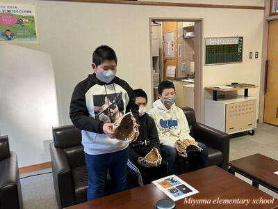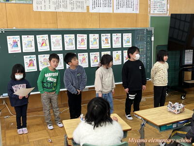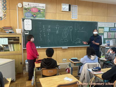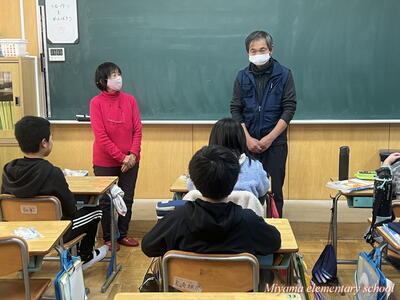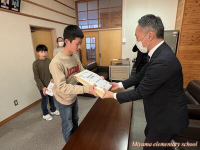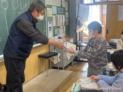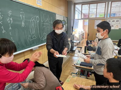 6年生が12月に描いた水墨画の年賀状は、「美術館への年賀状展」として市内各所で掲示されています。今日は年賀状展の主催者の方々が、学校で表彰式を開いてくださいました。出品した子には、それぞれに賞状と参加賞を、郵便局長さん等が選んだ作品には副賞もいただきました。ありがとうございました。表彰式に来てくださったのは、吉野ヨシ子先生です。田村市役所前のモニュメントを製作した彫刻家の先生でした。