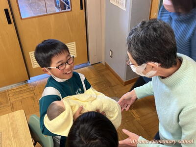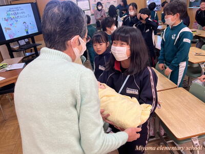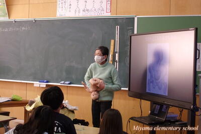 助産師の吉岡先生をお招きしての第2回目の思春期保健教室は、3年生と4年生で行いました。3年生は「いのちの始まり」について教えていただきました。始めは「画用紙に刺した針の穴」くらいの大きさからスタート、お母さんのおなかの中で大きくなって、およそ3000グラムで生まれてくるまでを知りました。実際に赤ちゃんの人形を抱いてみました。首を支えるようにそおっと抱きました。