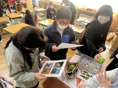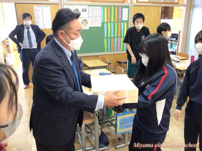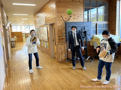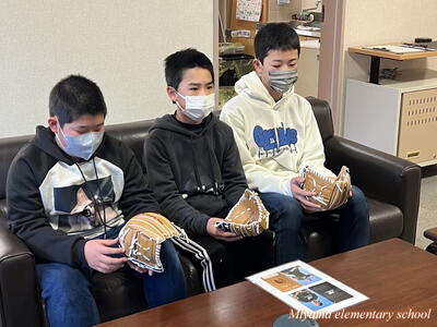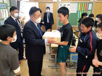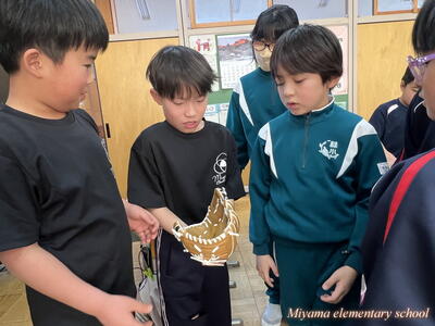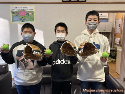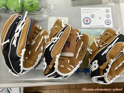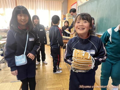 子どもたちが待ちに待った「大谷翔平選手のグローブ」が美山小にもやってきました。贈呈式は、感染症防止のためオンラインで6年生の代表児童に渡しました。「早くキャッチボールをしてみたい」などの感想を述べてくれました。代表児童はさっそく大谷選手のグローブを使ってキャッチボール。大谷選手の思いを受け止めていました。