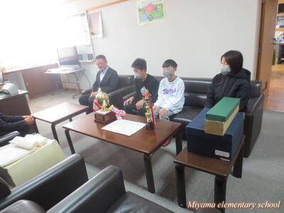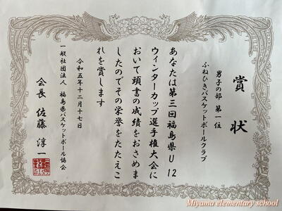 ふねひきバスケットボールクラブ(男子)が、昨年末に行われたウインターカップの県大会で優勝し、全国大会出場を決めました。冬休み中に代表選手と監督、保護者の方があいさつに来てくださいました。また、今日の全校集会で県大会優勝の紹介をしました。田村市のスポーツ少年団で全国大会出場は初めてのことだそうです。3月末に東京で行われる全国大会でも、精一杯、そして楽しくプレーしてほしいと思います。