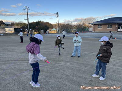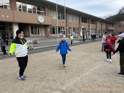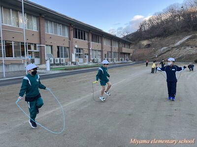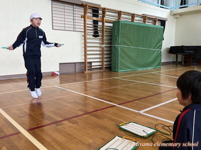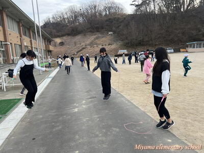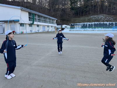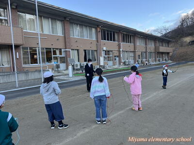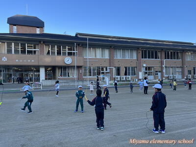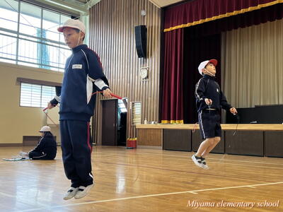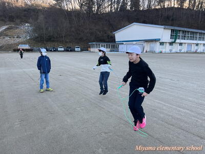 今日から朝マラソンにかわって朝なわとびを始めました。朝の始業前の時間に、校庭と体育館を使って全校生でなわとびで体力づくりです。一生懸命に前跳びをする子、あや跳びや交差とびを軽やかに跳ぶ子、二重跳びや二重あや跳びなどの高度な技に挑戦する子とさまざまです。みんなで練習すると、上学年の上手な跳び方を見ることができる、という利点があります。なわとび記録会に向けて、頑張れ、みやまっ子!