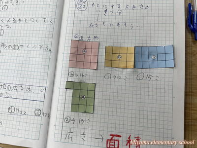4年生は、広さの学習です。陣取りゲームをしてから、誰がたくさん占領したのか比べました。初めて面積の単位「1㎠」を学習しました。広さを比べる共通の単位です。これから身の回りのものを「1㎠」を使って表せるようにします。