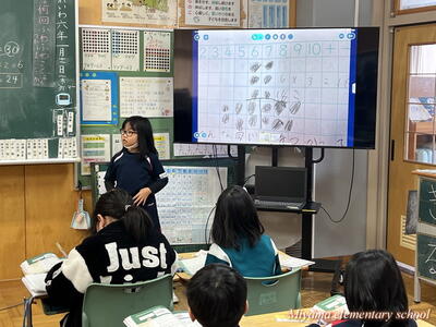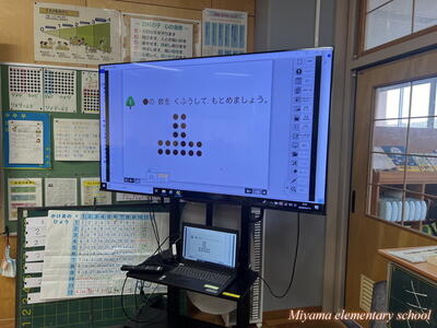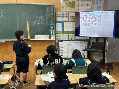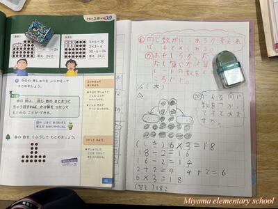 2年生は、学習したかけ算の発展問題にチャレンジしました。少し不規則に並んでいるドットを、数のまとまりに着目してかけ算で求めます。どのようなまとまりに見るかは、それぞれです。友達の意見を聞いて「そういう見方があるのか~」と気付いていた2年生。自分にない見方に気付けたのなら、学習が広がった証拠です。
