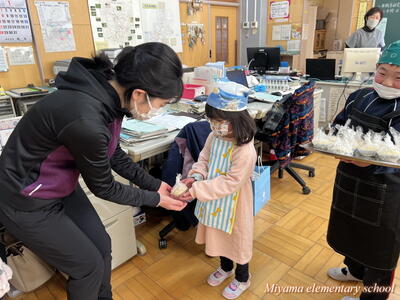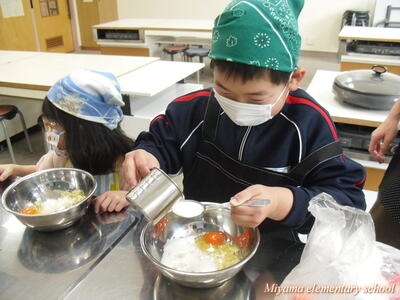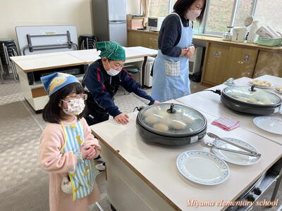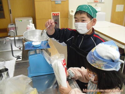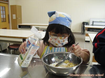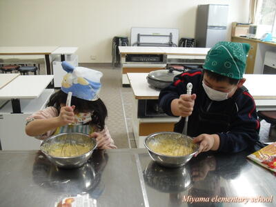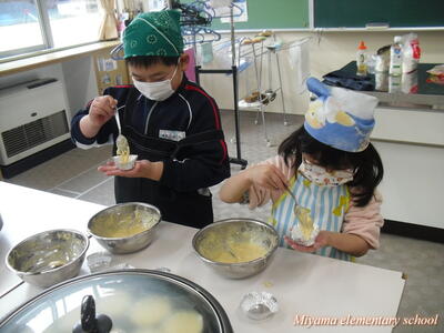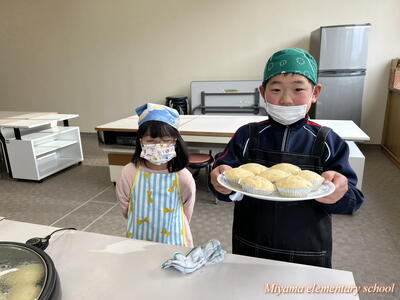 1年生と3年生は、蒸しパン作りに挑戦しました。もちろん、作る手順をしっかり確認し、材料の重さや量を正確に量ってつくるという学習です。でも、できあがりがとても楽しみになる学習です。バナナ味とココア味の2種類の蒸しパン。「おいしくできました」ということで、先生方にもおすそ分け。お店で売っているパンのようにおいしくできていました。ごちそうさまでした。