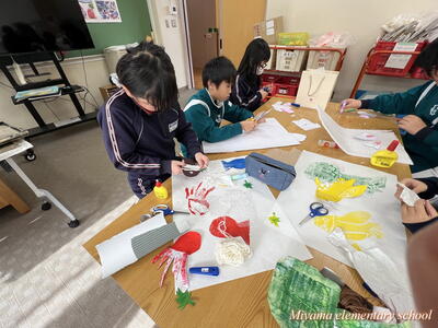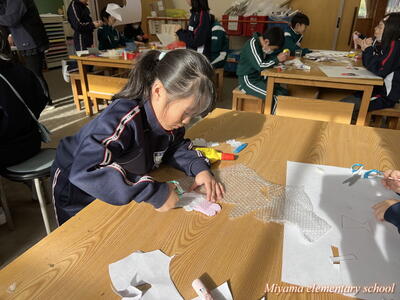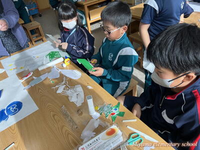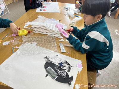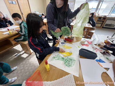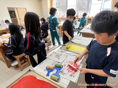 2023年12月19日 18時43分3年生は図工で紙版画の作品をつくりました。版は紙だけではなく、紙にしわをつけてみたり、紙にプチプチやネットを貼り付けてみたりして、自分の表したいものが効果的に表現できるように考えていました。刷り上がりを予想しながら版をつくるおもしろさがあります。もし刷り上がりが自分の思ったものと違っていたら、版を変えることもできます。いい感じに刷り上がると、ちょっと感動します。