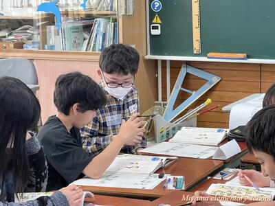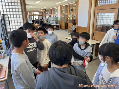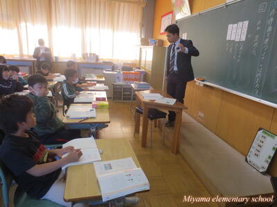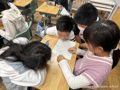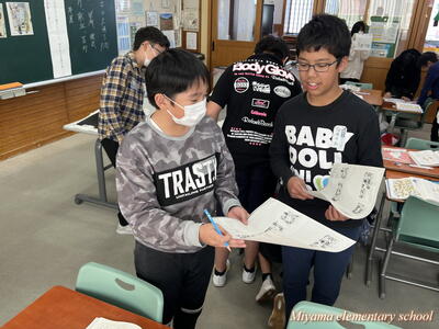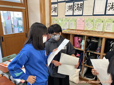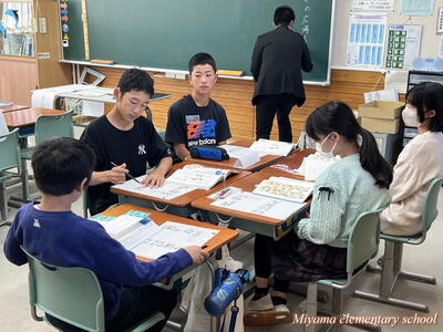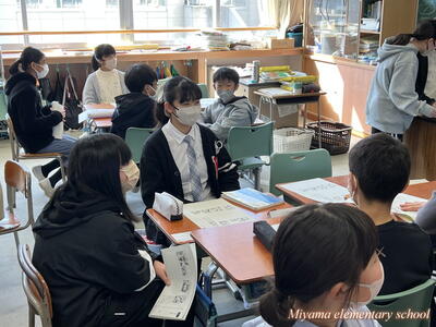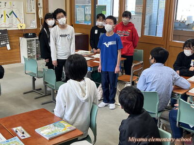 6年生は、船引小学校に出かけて、船引小の6年生と交流をしてきました。いずれ中学校で同じ学年になる仲間です。小学校段階で、少しでも互いに顔や名前を覚えたり、仲良くなれたりできれば・・・という意図で実施しました。最初の時間は、国語です。船引小学校は一クラス25人ほど。そこに5人ほどの美山小が加わって学習しました。初めは緊張!どう話しかけていいのか、何をしていいのか、わからないのは当然です。しかし、船引小の友達も同じように緊張していたのです。次第に、声をかけられるようになりました。