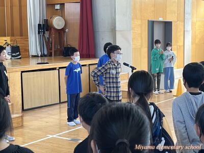 お昼の放送で、みやまっ子フェスタ(学習発表会)のテーマが発表されました。「一致団結!統合後初のみやまっ子フェスタ、126人の元気をとどけよう!!」実行委員会が頭をひねりながら、言葉を紡ぎ出しました。各学年からは「協力」「仲間」「元気」「楽しく」など、フェスタに対してどう向き合っていきたいか、様々な意見が出されました。それらを「一致団結」して「126人(みんな)」で「元気」を伝えたい、というところにまとめたようです。