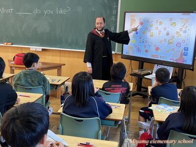 今日はハロウィンのお祭りの日でした。昨日の外国語活動では、ウデン先生がハリーポッターのコスチュームで登場。気分を盛り上げてくれました。