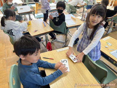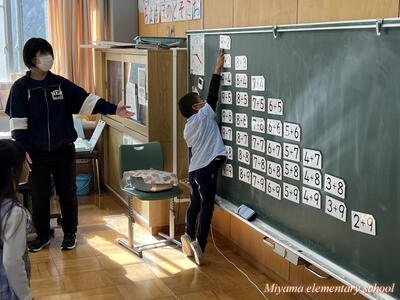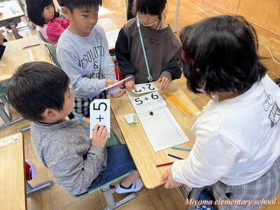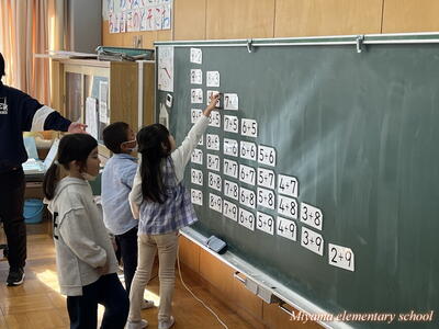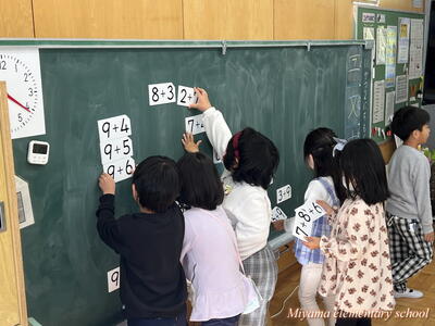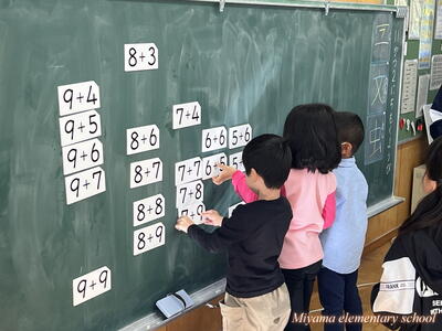 1年生は繰り上がりのあるたし算を学習しています。計算の仕方も説明できるようになりました。次に計算カードを使って、答えを速く、正確に導けるように練習します。今日は大きな計算カードを黒板に貼って、気付いたことを話し合いました。「答えが12になる式は?」子どもたちは次々に答えが「12」の式を見つけます。すると「あれ?」「階段みたいになっている」と、規則性に気付いていきます。計算カードは様々な使い方ができます。計算に慣れるように、工夫して活用していきます。