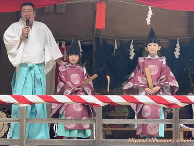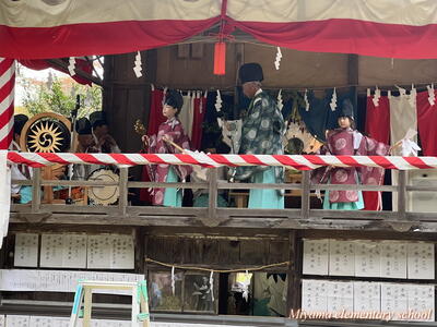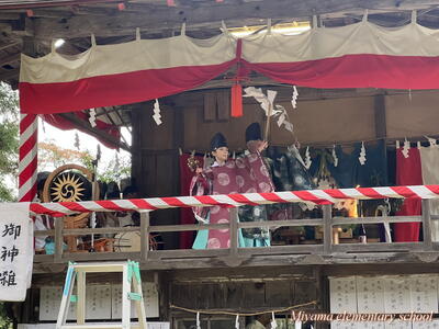 三連休の間、各地区では祭礼がありました。子ども神輿を引いたり、巫女舞を奉納したり、三匹獅子子ども神楽を披露したり。中には、祭礼前の数日間、公民館等に集まって練習をした子もいたようです。どの祭礼でも、それぞれの役割をしっかりと果たし、地域の一員として立派に活躍していました。写真は、大倉地区の太々神楽の子ども神楽の様子です。よく踊りを覚えたなあと思います。