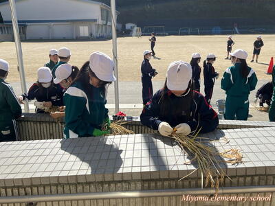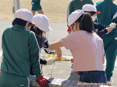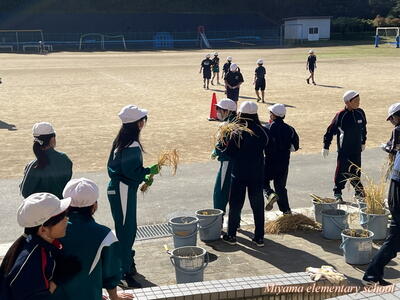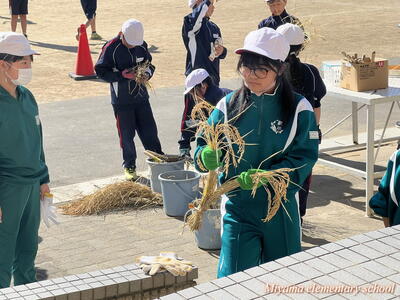 5年生は、学校で育てているバケツ稲の稲刈りを行いました。実際の田んぼで経験しているので、鎌の扱いも慣れたものです。あっという間に刈り取り、束ねました。刈り取った稲は、天日に干して乾燥させ、後日籾すりをします。