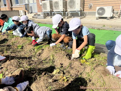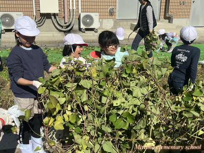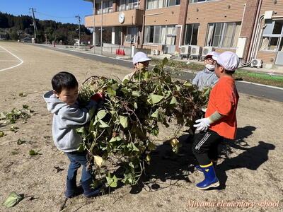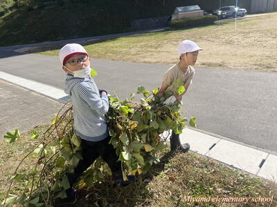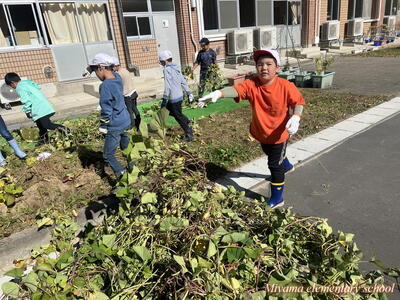 2年生の育てていたサツマイモを、今日収穫しました。サツマイモの茎も葉も、まだまだ青々として立派です。茎を取り除かないとサツマイモに届きません。
