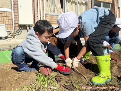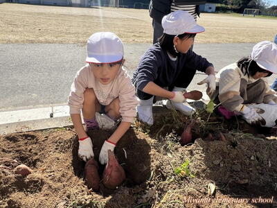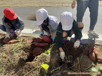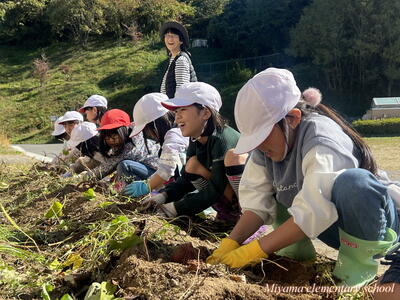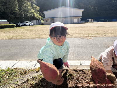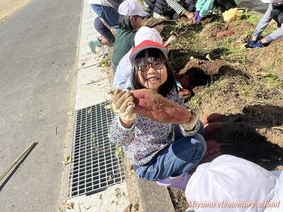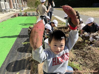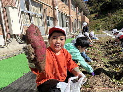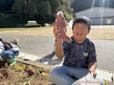 予想どおり大きなサツマイモ。「太~い」「おっきい」歓声が沸き起こります。肥料がよかったのでしょうか。子どもたちの手入れがよかったのでしょうか。かなり大きなイモがたくさん収穫できました。自宅に持ち帰りましたので、ぜひ味わってみてください。おいしいといいなあ。