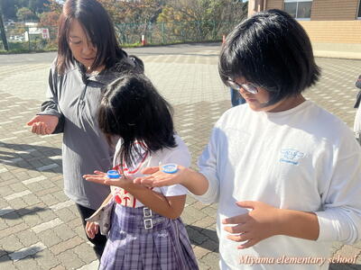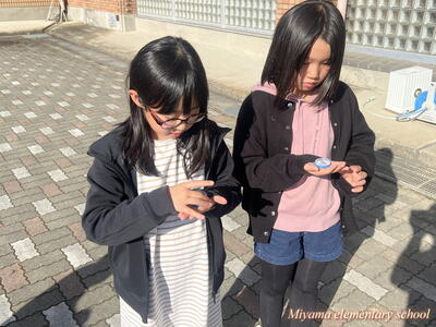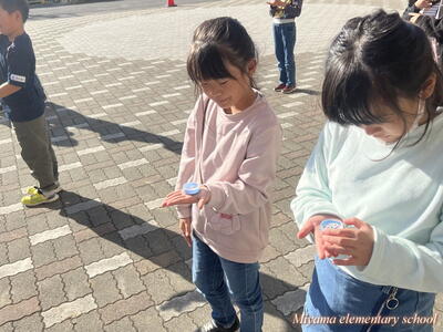 3年生は校庭に出て、手のひらに小さな物をのせて、体の向きをあちこちに変えています。学習していたのは、方位磁針の使い方でした。理科でも社会でも、方角を知るためには重要なアイテムです。「よし、使い方はマスターした」「何に使う?」「冒険に行きます」と3年生。