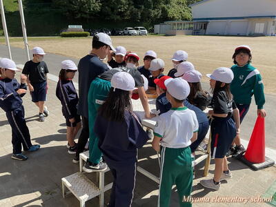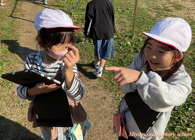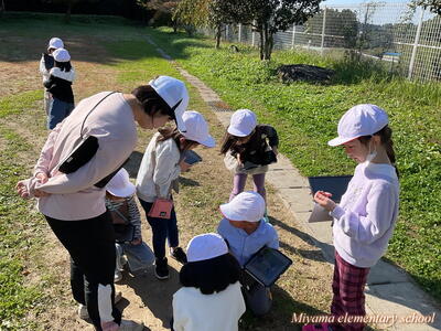 2023年10月19日 17時06分1年生は、国語で校庭などで見つけたものを友達に知らせる学習をします。まずは校庭で友達に「知らせたい」と思うものを探しました。オンブバッタを見つけては歓声を上げ、椿の実の堅さに驚きの声を上げます。どんな小さな物にも感動できる1年生の感性は、とても輝いています。