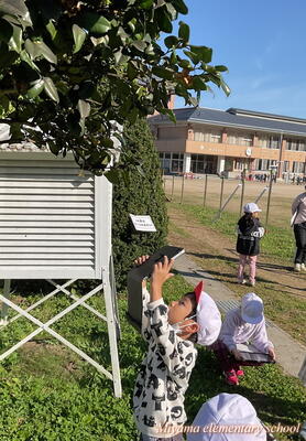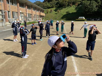 3年生は理科で「太陽とかげのでき方」を調べています。かげは太陽によってできていることに気付いた子どもたちは、まず太陽を観察します。「遮光プレート」という目を保護する板を使って、太陽の方角を確認しながら、かげのできる方向を確かめます。「やっぱり、太陽の反対側だ」予想は大当たりです。
