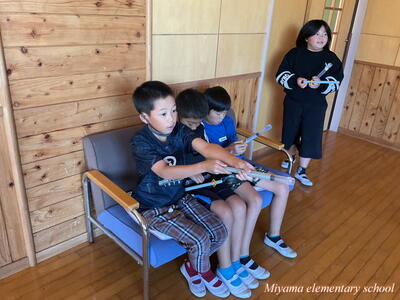 4年生は、閉じ込めた空気にどんな力があるのかを調べました。筒の先に玉を込めて、筒の反対側から押し棒で空気を押すと、勢いよく玉が飛び出します。「何が玉を押したの?」「空気だよ」「どうして空気があると玉があんなにビューンと出るの?」いろんな疑問が出てきます。これから実験をとおして解決していきます。