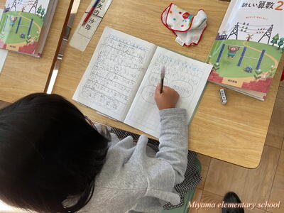 2年生は算数で「いくつずつ、何こ分で、いくつ」という計算を学習しています。遊園地の乗り物に「1台に5人ずつ乗っている乗り物が3台で15人いる」ということを式に表します。これまでの学習を使えば、たし算で5+5+5=15ですが、子どもたちはすでに感じています。「かけ算だ」「5×3だ」「15だ」ひそひそ声が聞こえます。でも新しい計算なので、知らないふりをして、ていねいに説明します。最後には「やっぱりかけ算だ!がんばるぞ」と、やる気満々の2年生です。