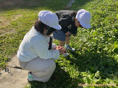 1年生は、国語で校庭などで見つけたものを友達に知らせる学習をします。まずは校庭で友達に「知らせたい」と思うものを探しました。オンブバッタを見つけては歓声を上げ、椿の実の堅さに驚きの声を上げます。どんな小さな物にも感動できる1年生の感性は、とても輝いています。