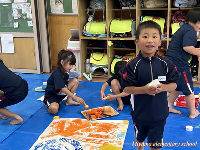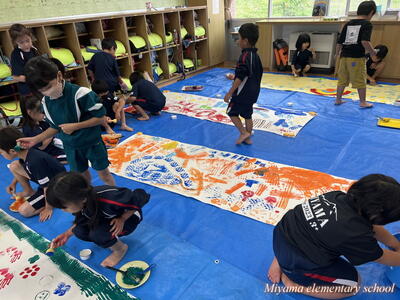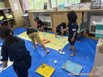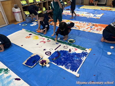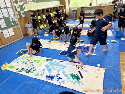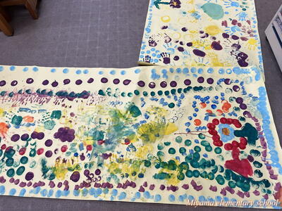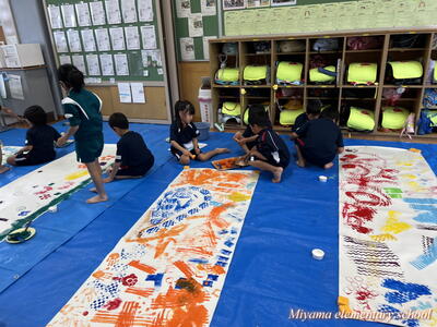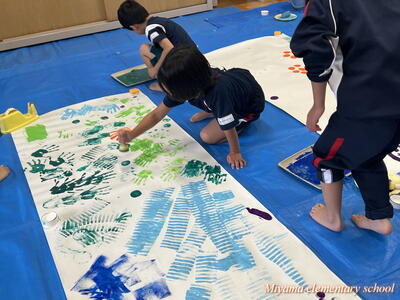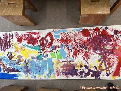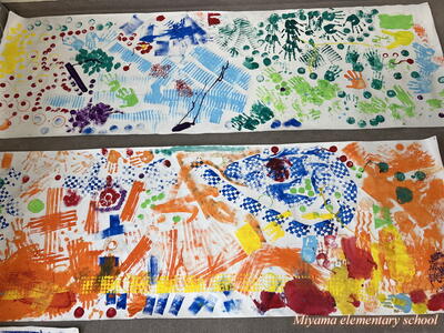 1年生は図工で身の回りにあるものをスタンプにしたり、スポンジローラーをコロコロしたり、手に絵の具をつけてペッタンしたりして、造形遊びをしました。友達と一緒に、大きな紙に思いっきり表現しましたので、楽しいに決まっています。同じ色でも、同じ形が連続すると、それだけでおもしろい模様になっていきます。楽しい作品ができました。