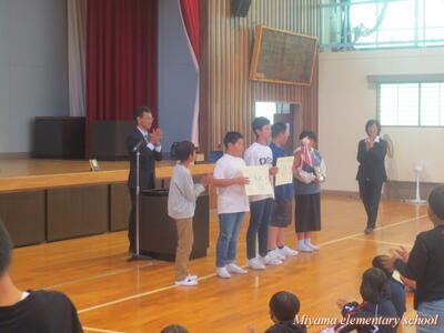 修了式後には、理科作品展の表彰とスポーツ少年団の表彰を行いました。夏休みやお休みの日に頑張った成果です。あめでとうございます。