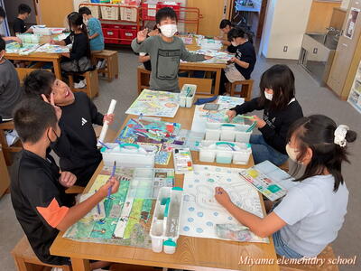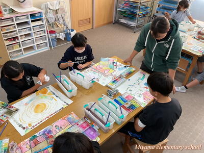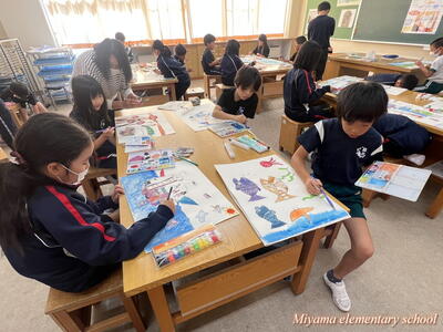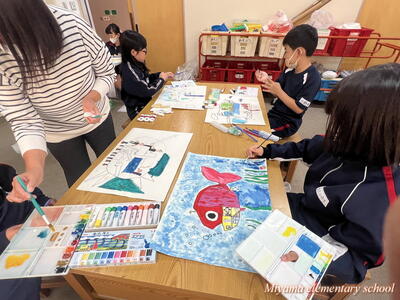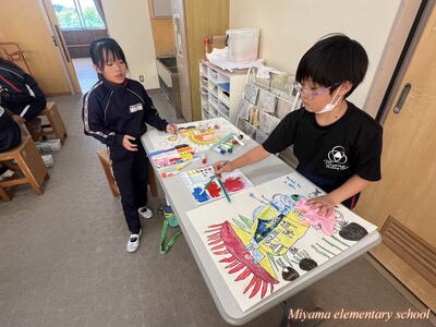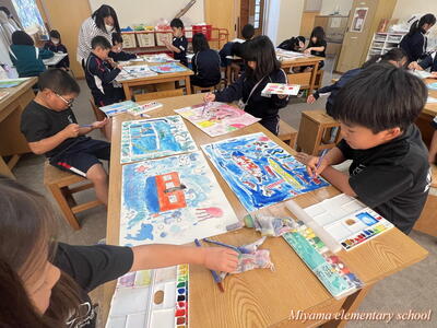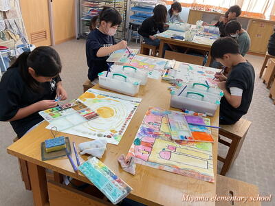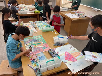 3年生は図工で「ふしぎな乗りもの」の絵を描きました。水彩絵の具を使って、ていねいに、きれいな色をつくって染めていました。4年生は、「へんてこ山」という言葉から想像した物語の絵を描きました。4年生も水彩絵の具で、ブラシやラップの芯など筆以外の描画材も使って、とてもきれいに色をつけていました。色をつけているときの子どもたちは、本当に集中しています。話しかけるのが申し訳ないくらいです。