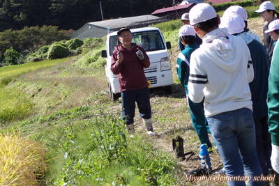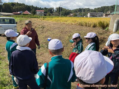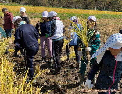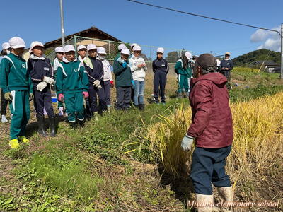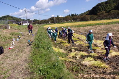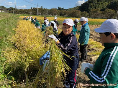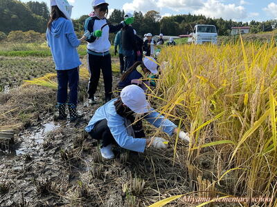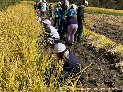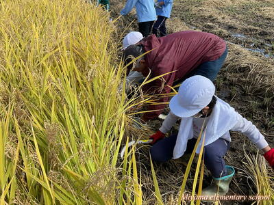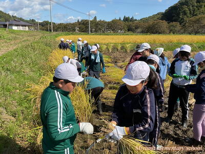 5年生は、秋晴れの下、春に自分たちで植えた田んぼの収穫、稲刈りを実施しました。瀬川小学校前の田んぼで田植えを教えていただいた面川さんに、またお世話になりました。15cmほどだった苗が、今では1m以上の長さになり、黄金色の稲穂が頭を垂れていました。子どもたちは、稲刈り用の鎌をつかって、一株一株ていねいに刈り取っていました。さて収穫したお米はどうしますか? みんなで考えます。