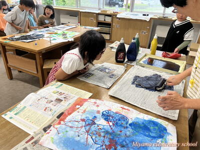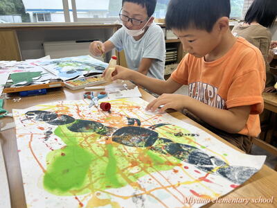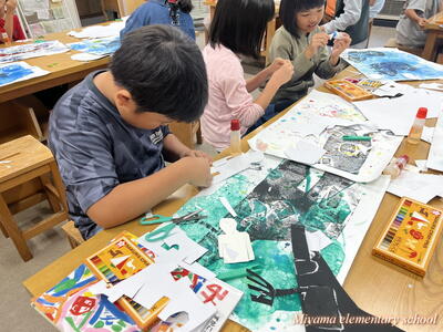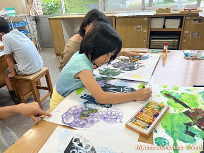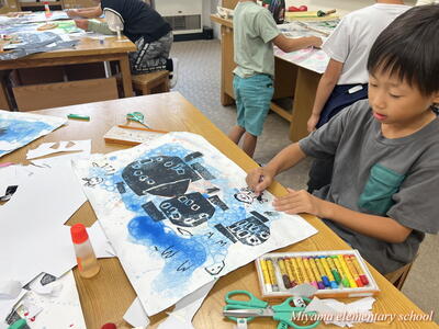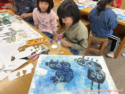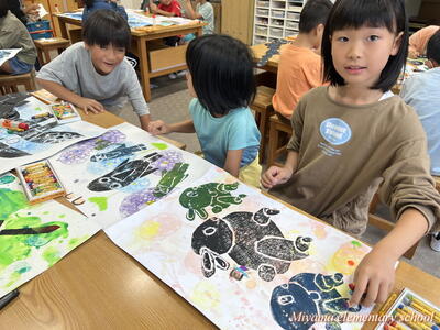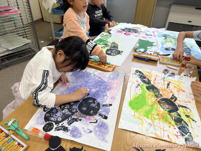 以前シャボン玉の模様を画用紙に付けて造形遊びをした2年生は、そこから想像した世界を紙版画で表しました。きれいなシャボン玉模様ができているので、想像する世界も広がります。海の世界に泳ぐ大きな魚だったり、草原にくつろぐウサギだったり、氷の上のペンギンだったり。ていねいに画用紙で版をつくって刷り上げました。もうすぐステキな作品が完成です。