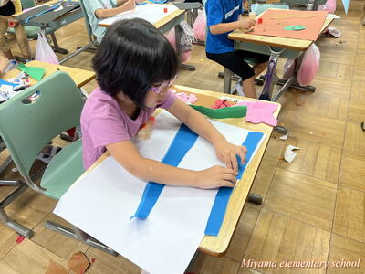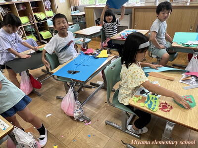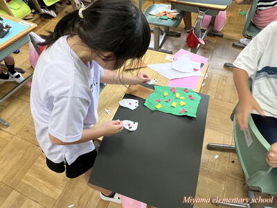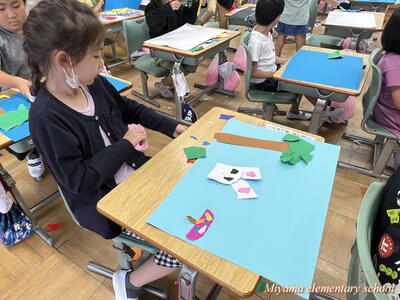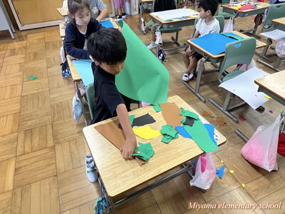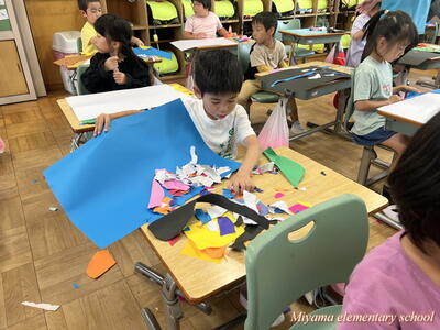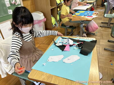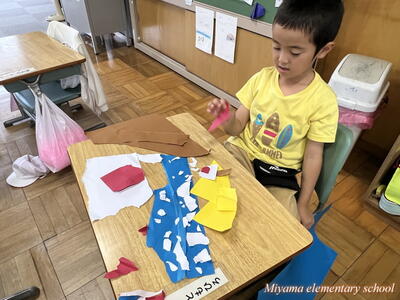 1年生は、色画用紙を手でちぎって、できた形から想像して絵を作る活動をしました。まず色画用紙をちぎるのが楽しいようで、ビリビリやぶって楽しみました。そこから想像する絵は、子どもたちの自由な発想が発揮されます。海の世界だったり、かわいい動物だったり、ちぎった紙を貼ってちぎり絵が完成です。