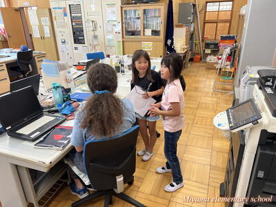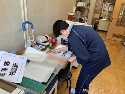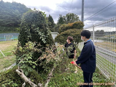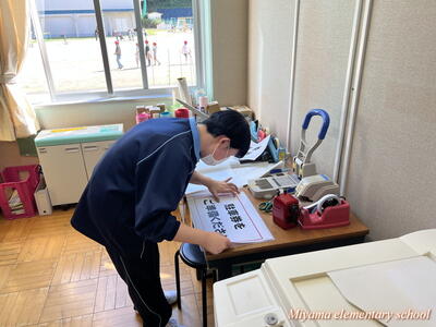 今日から職場体験(デュアル実習)で、船引高校の生徒が、美山小学校で事務や用務の仕事を実習します。今回来てくれたのは、瀬川小学校の卒業生です。さっそく、学校の衛生管理の仕事や掲示物の作成、危険物の除去(ハチの退治)など、たくさんの仕事をしてくれました。週に1回のペースで、2月まで実習します。がんばってくださいね。