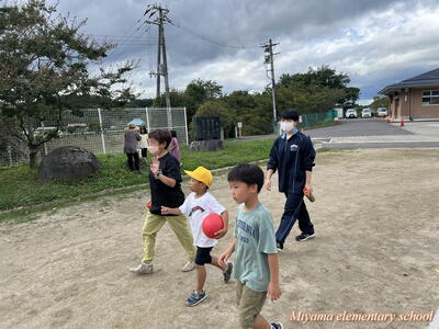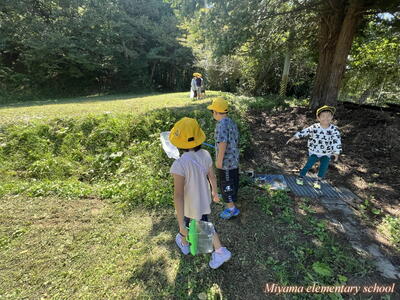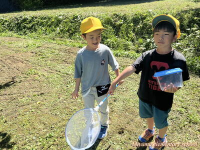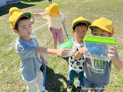 1年生は、秋の虫をさがしに校庭を歩きました。「カナヘビつかまえた」「トンボがいたよ」と、ものの数分でたくさんの虫を集めました。カマキリとトンボを同じ虫かごに入れていたら、いつの間にか・・・。「カマキリはおなかがすいていたのかな?」