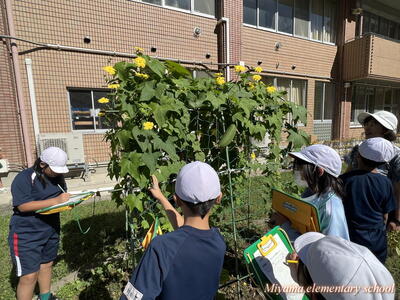 4年生は、理科の時間に育てていたヘチマを観察しました。お花とめ花がきれいに咲いていて、小さなヘチマのもと?も観察できました。中には、4年生の腕ぐらいに大きくなったヘチマもありました。「いつの間に大きくなったんだ!」