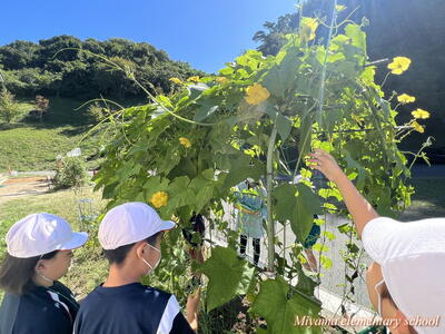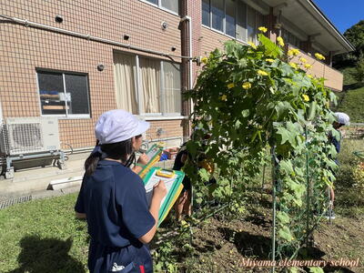 2023年9月29日 17時57分4年生は、理科の時間に育てていたヘチマを観察しました。お花とめ花がきれいに咲いていて、小さなヘチマのもと?も観察できました。中には、4年生の腕ぐらいに大きくなったヘチマもありました。「いつの間に大きくなったんだ!」