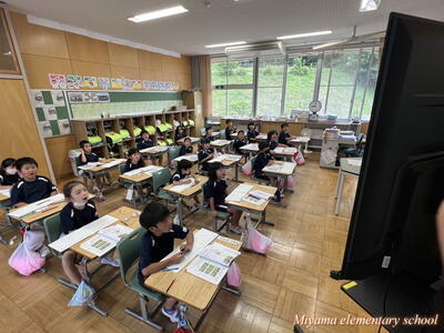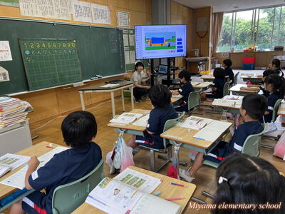 1年生の算数では、バスに乗っているねこのアニメーションを見ながら、その状況を式に表す学習をしました。「ねこが9匹います。1匹降りました。」子どもたちは、すぐに答えを見つけることができます。でも、今日はこのことを式にすることが目標です。お話が続き、「次のバス停では3匹降りました。」さっきの式と異なる式をつくります。算数の式は、物語の一場面を表すことを学びました。算数を学習していく上で、とっても大切な学びです。